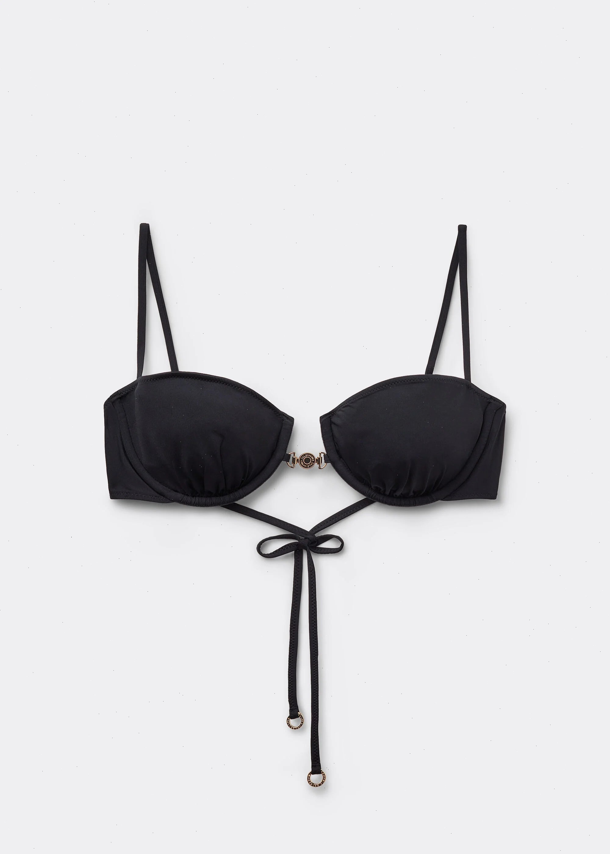 This underwire balconette bikini top is designed with a minimal, unpadded structure that sculpts the bust while maintaining a sleek, barely there feel. Made from bright silk-effect fabric with a luminous sheen, it’s elevated by refined gold detailing at the center, adding a subtle statement to the clean lines of the design. Adjustable shoulder straps and a distinctive string tie fastening at the back offer both flexibility and support, while the sculpted cups enhance natural shape with understated structure. With its pared-back silhouette and softly lustrous finish, this minimalist bikini top balances sensuality and simplicity for a refined swimwear look that stands out without needing to shout. Style it with the matching bottoms for a polished set that catches the light from every angle.