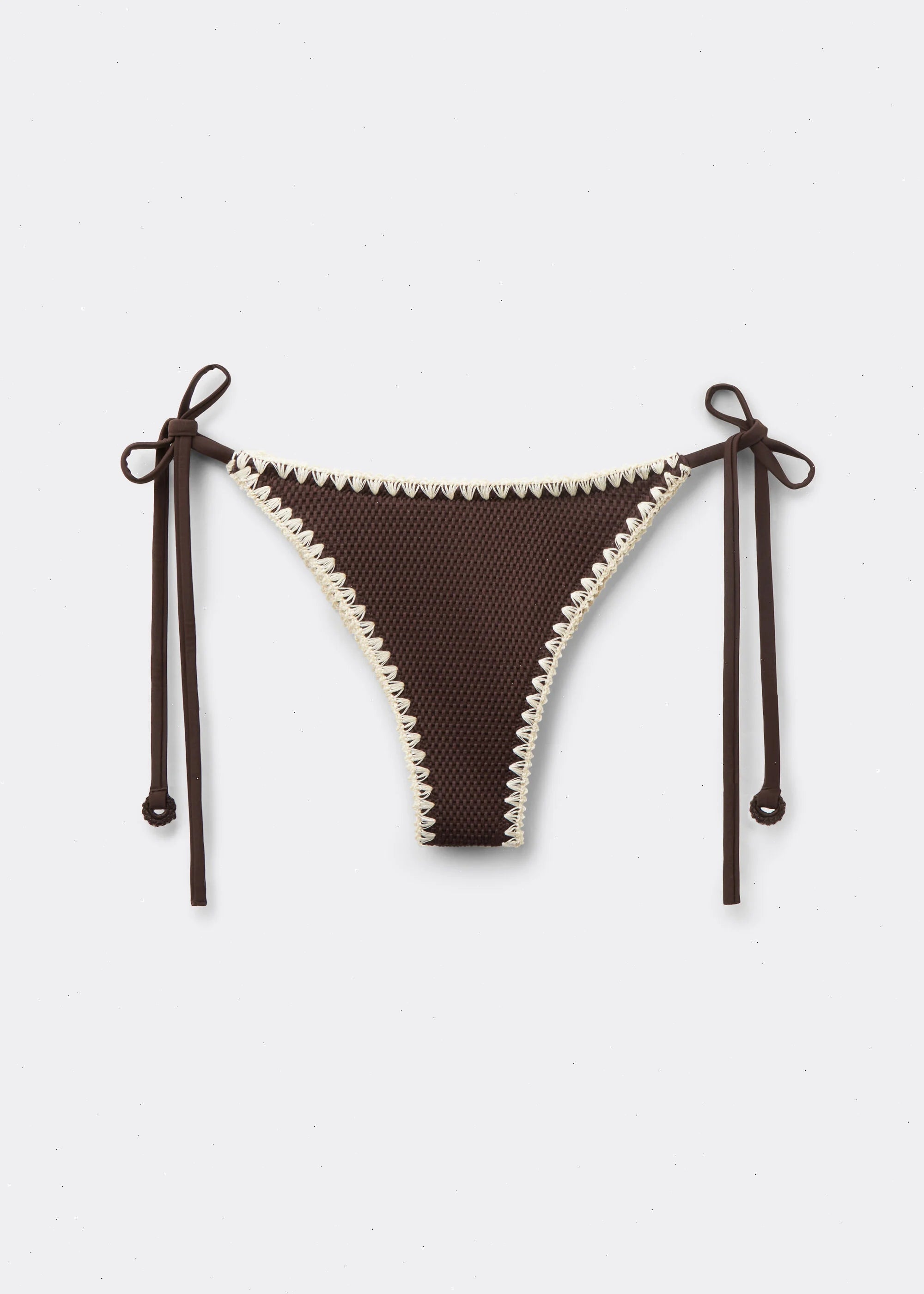 Brazilian bikini bottom with adjustable side ties for a perfect fit. Soft fabric in light relief with elegant contrasting embroidery. The slightly rounded waist at the front allows for wear with classic coverage or a higher leg, depending on your body shape.