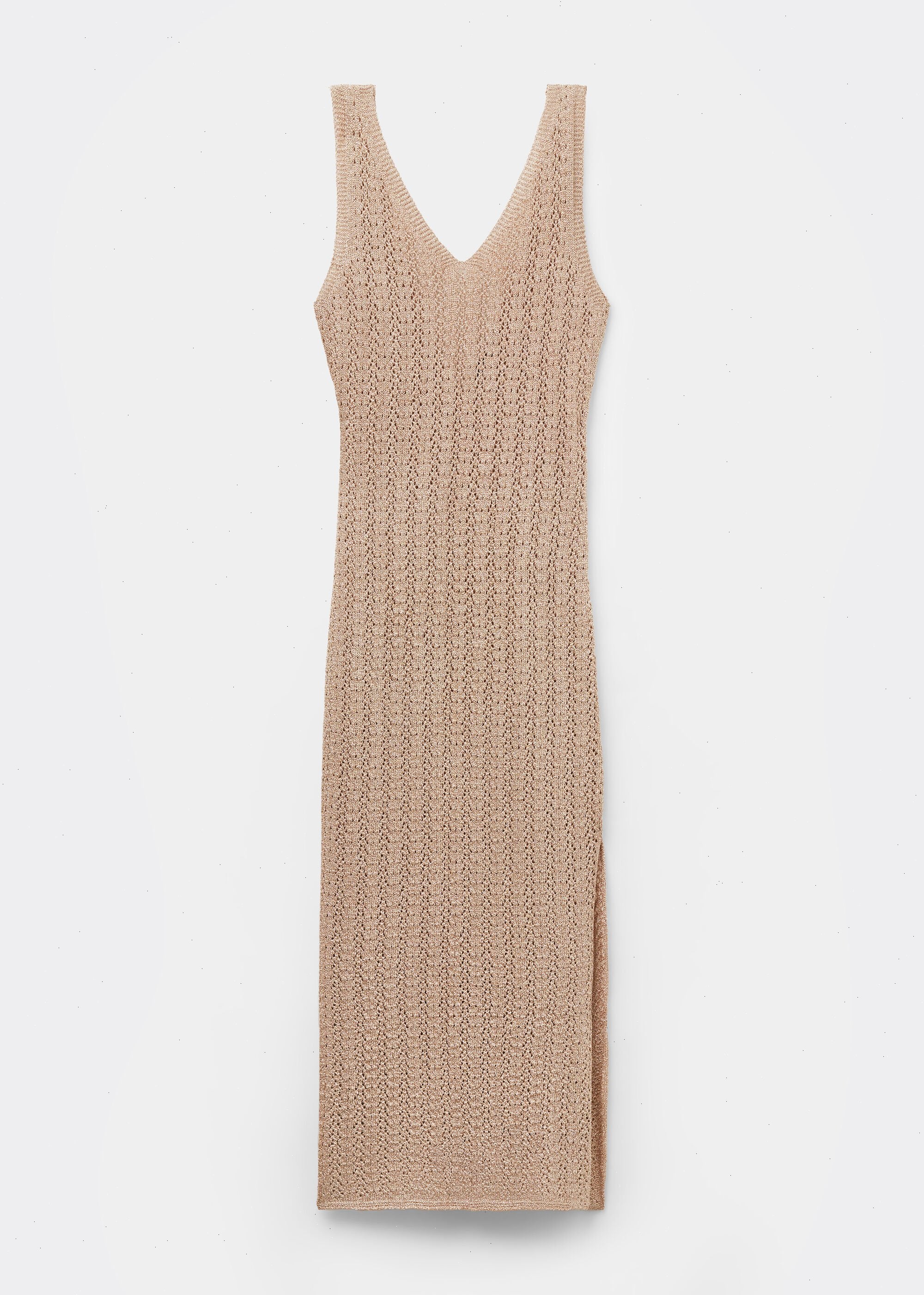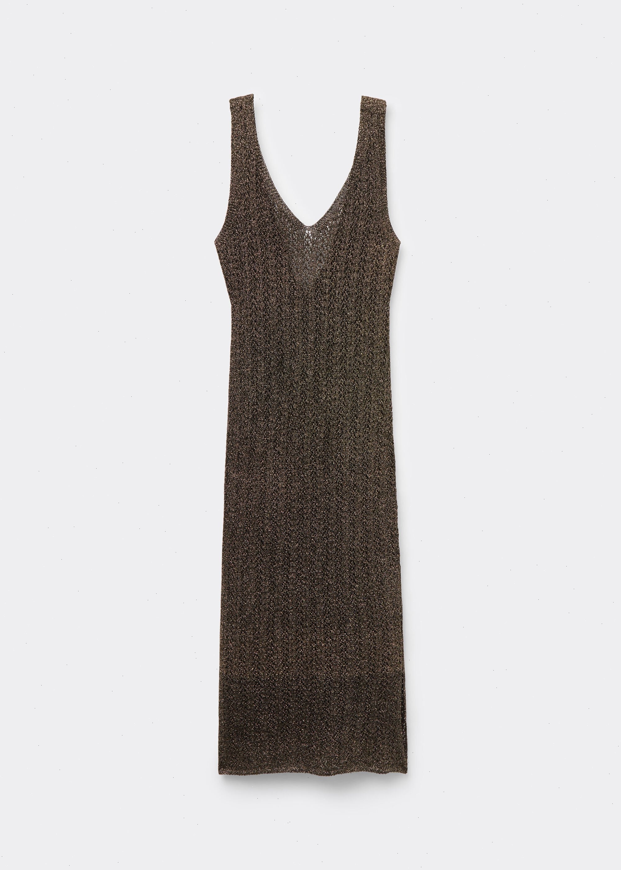 Maxi dress crocheted in refined golden lamè, featuring and elegant V neckline on both the front and back. The sophisticated side slits provide movement and lightness, exalting the silhouette. Perfect for sophisticated and versatile looks, ideal to wear on top of beachwear or for special chic appeal occasions.