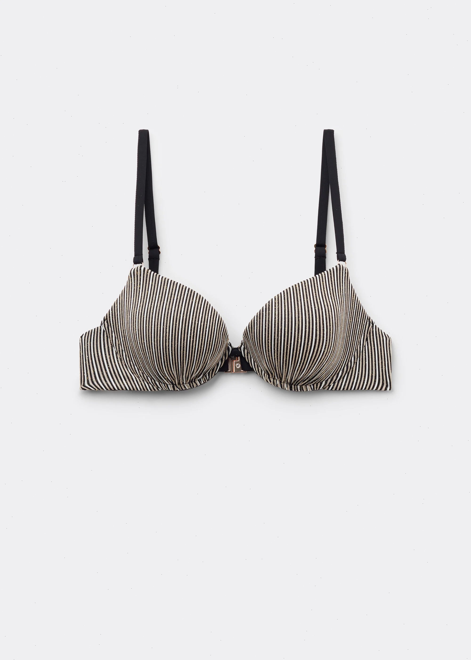 Push-up bikini top with lightly padded cups and underwire for support and volume. The style features a gold-based striped pattern that adds a bright and sophisticated touch. Fixed shoulder straps. Back hook closure with double adjusters.