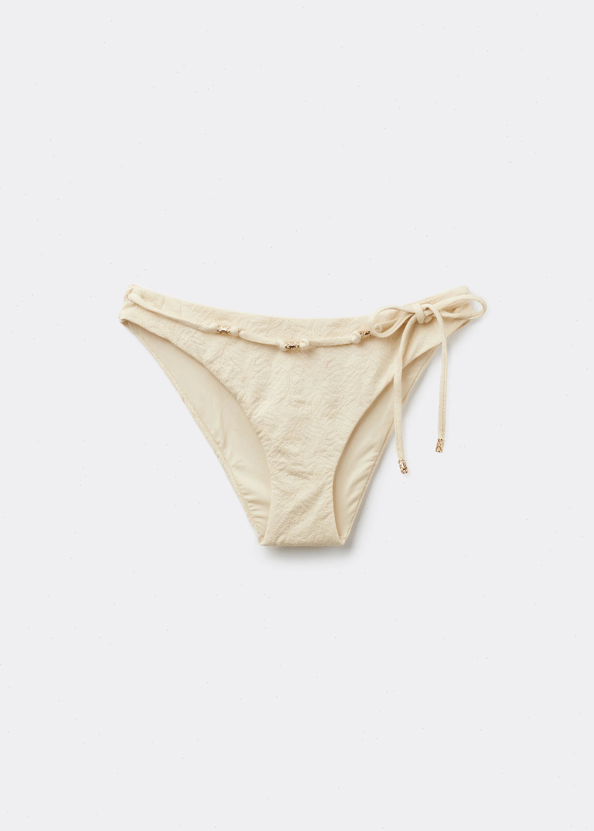 Fully lined bikini bottom with invisible seams. Soft tone-on-tone foliage jacquard fabric, illuminated by precious golden details. The slightly rounded waist at the front allows them to be worn with classic coverage or a higher leg, depending on your body shape.