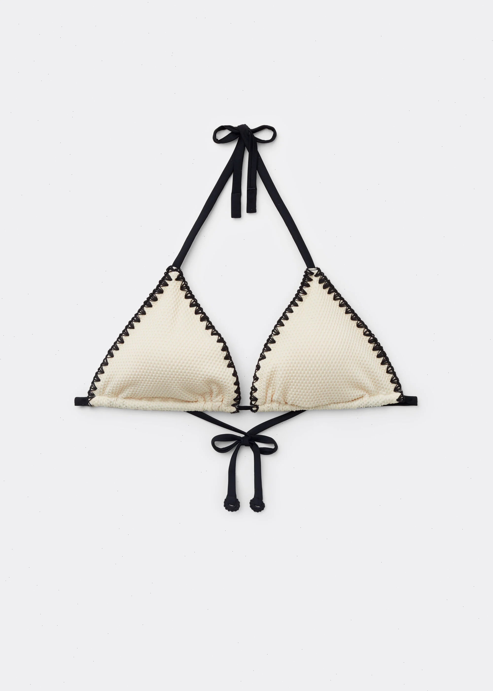 Wireless triangle bikini top with removable padding. Soft, slightly embossed fabric, embellished with contrasting embroidery on the edges that enhances the design with distinctive character and elegance. The shoulder straps have eyelets on the ends so they can be hooked onto the back band or tied around the neck. Back thin tie closure.